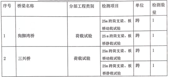 2.項目內(nèi)容:對碧峰峽路下段道路狗腳灣橋、三興橋進行動、靜荷載試驗。