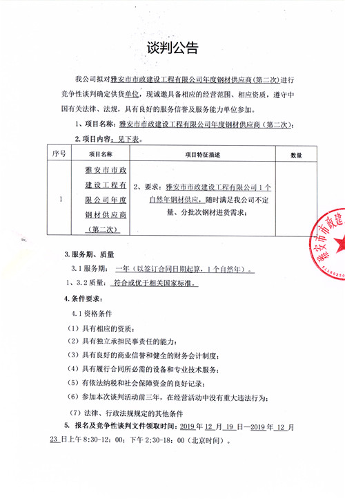 雅安市市政建設工程有限公司年度鋼材供應商競爭性談判公告(第二次)
