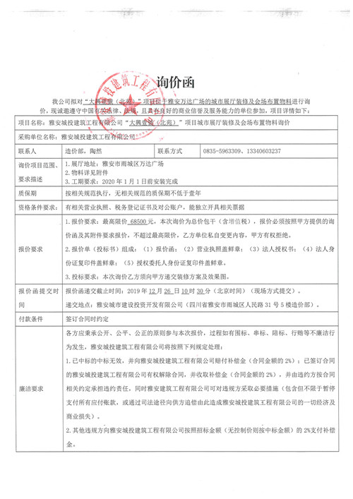 大興壹號(hào)(北苑)項(xiàng)目位于雅安萬(wàn)達(dá)廣場(chǎng)的城市展廳裝修及灰塵布置物料詢(xún)價(jià)函