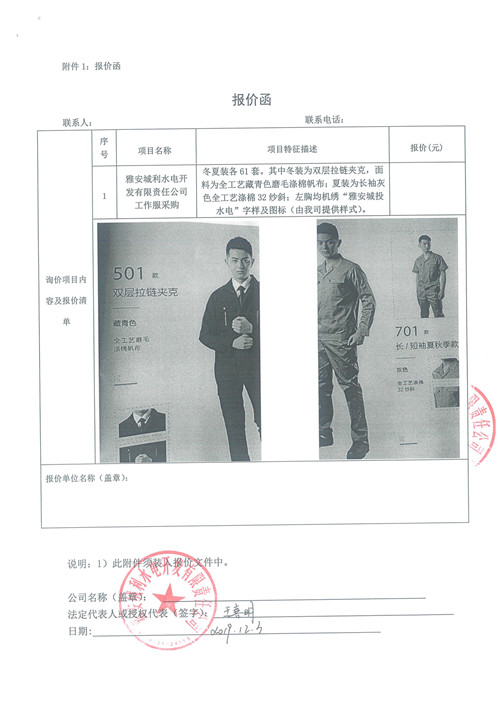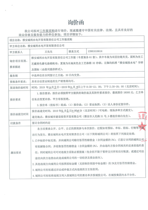 雅安城利水電開(kāi)發(fā)有限責(zé)任公司工作服采購(gòu)詢價(jià)函
