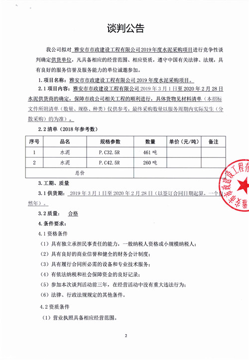 市政公司2019年度水泥采購(gòu)項(xiàng)目競(jìng)爭(zhēng)性談判公告
