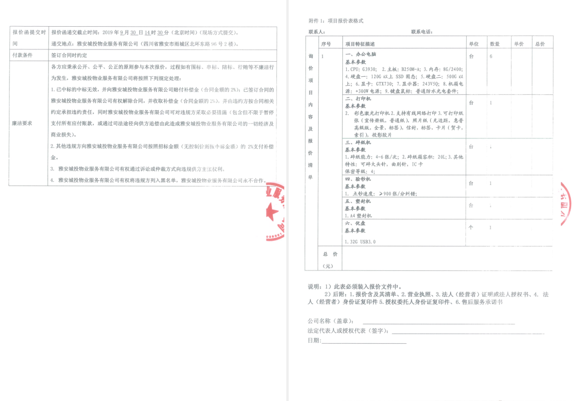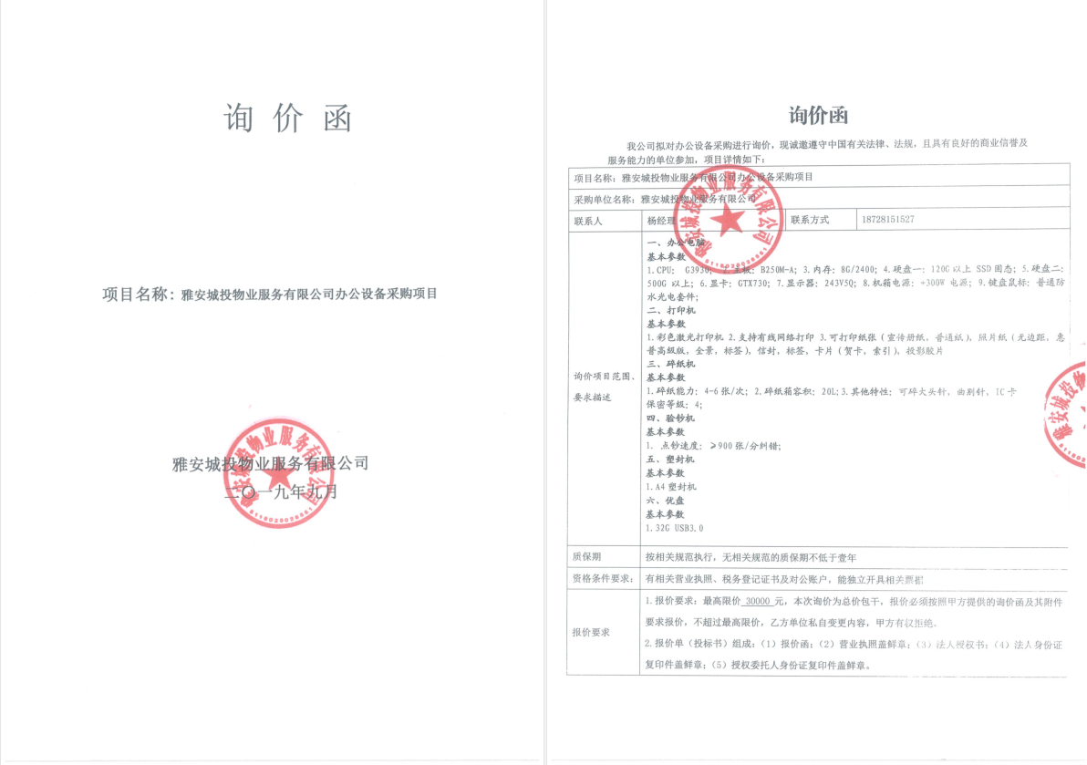 雅安城投物業(yè)詢價函(辦公設(shè)備)