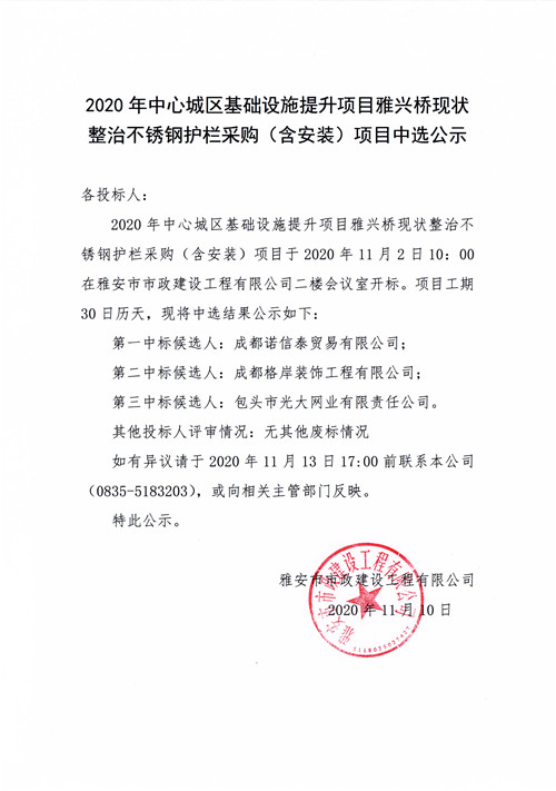 2020年中心城區(qū)基礎(chǔ)設(shè)施提升項目雅興橋現(xiàn)狀整治不銹鋼護欄采購(含安裝)項目中選公示