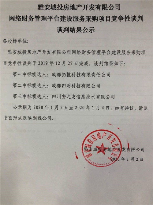 雅安城投房地產(chǎn)開發(fā)有限公司網(wǎng)絡財務管理平臺建設服務采購項目競爭性談判結果公司