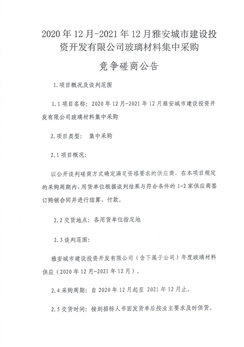 2020年12月-2021年12月雅安城市建設(shè)投資開發(fā)有限公司玻璃材料集中采購競(jìng)爭(zhēng)磋商公告