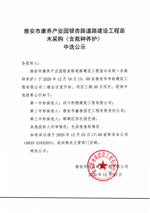 雅安市康養(yǎng)產(chǎn)業(yè)園銀杏路道路建設(shè)工程苗木采購(含栽種養(yǎng)護)中選公示