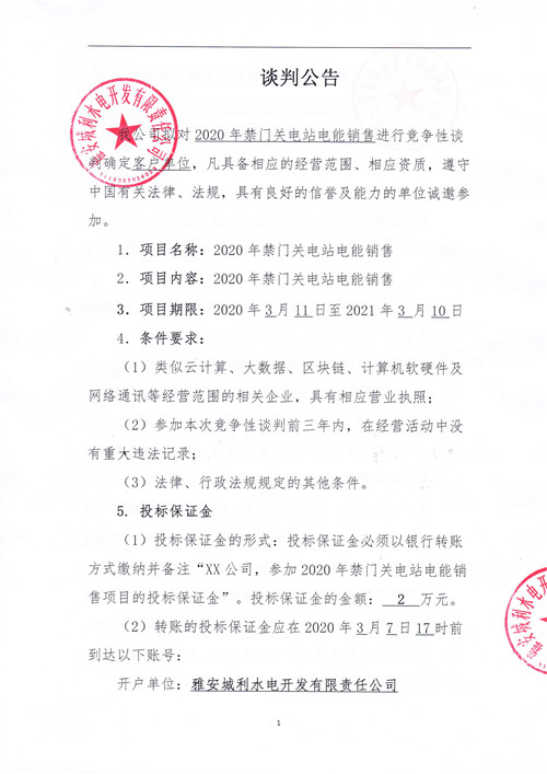 2020年禁門關(guān)電站電能銷售競爭性談判公告