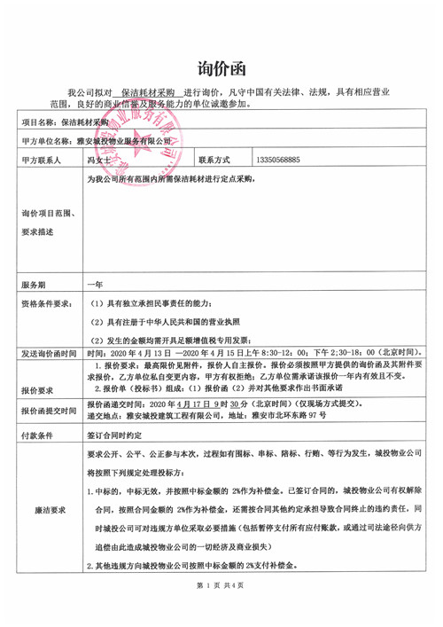 城投物業(yè)公司保潔耗材采購(gòu)詢價(jià)函(第二次)