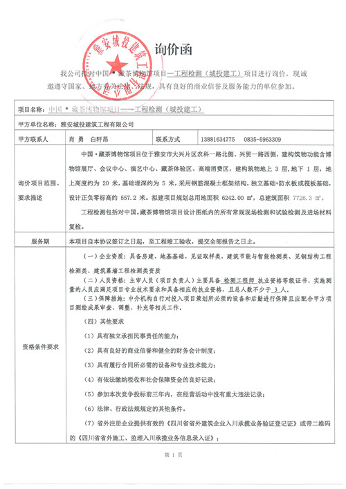 中國·藏茶博物館項目——工程檢測(城投建工)項目詢價函