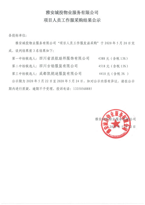城投物業(yè)公司項(xiàng)目人員工作服采購(gòu)結(jié)果公示