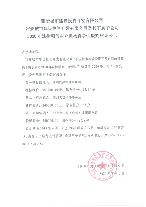 雅安城市建設(shè)投資開發(fā)有限公司及其下屬子公司2020年法律顧問(wèn)中介機(jī)構(gòu)競(jìng)爭(zhēng)性談判結(jié)果公示