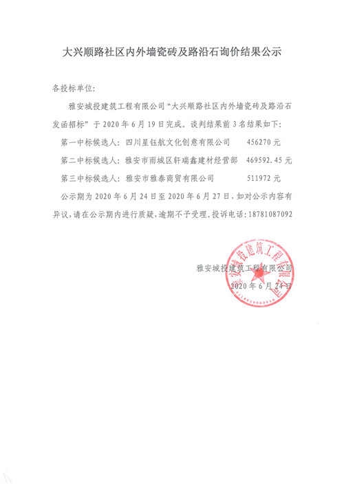城投建工公司大興順路社區(qū)內(nèi)外墻瓷磚及路沿石詢價結果公示