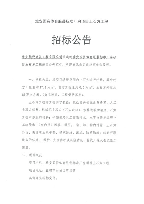 城投建工公司雅安國資體育服裝標準廠房項目土石方工程招標公告