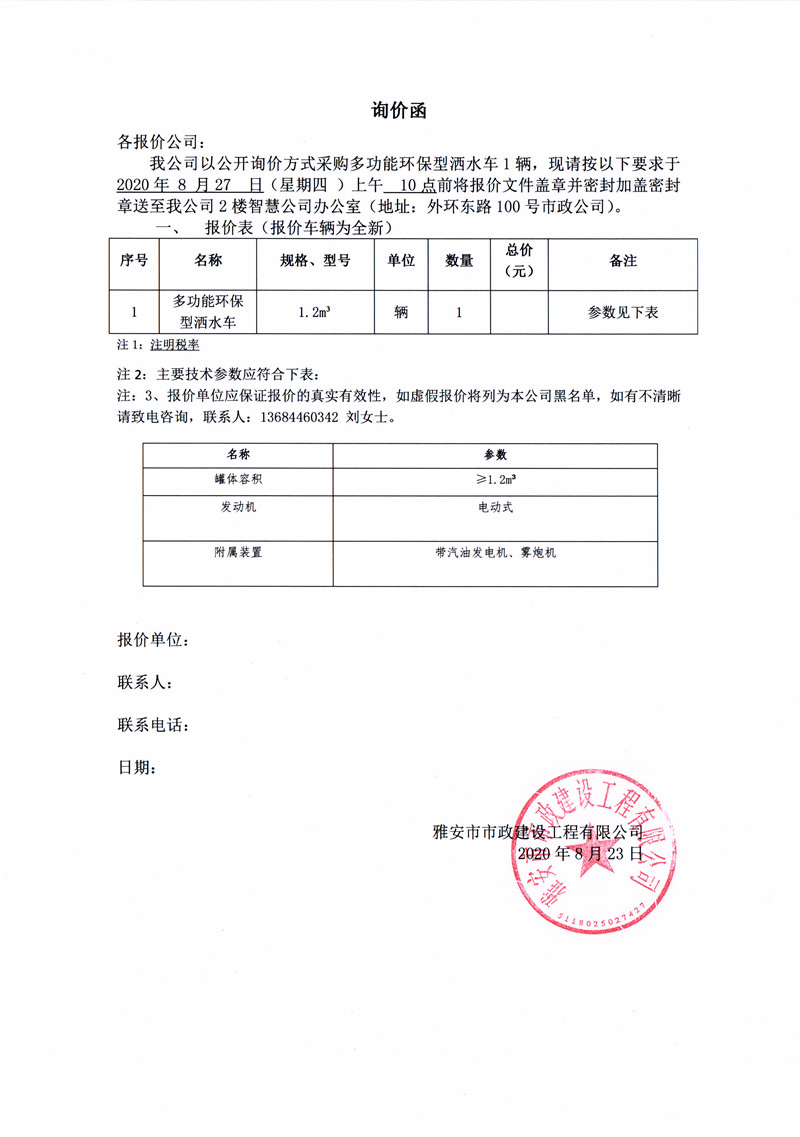 雅安市市政建設(shè)工程有限公司采購多功能環(huán)保型灑水車詢價(jià)函