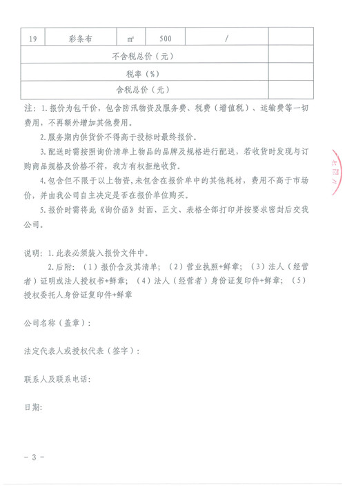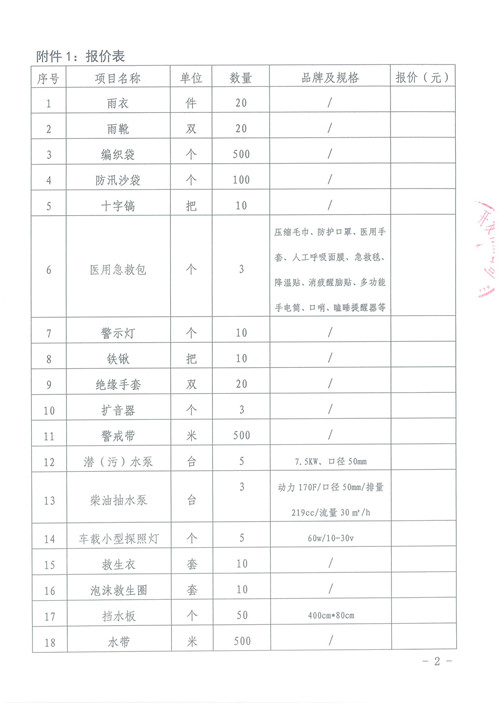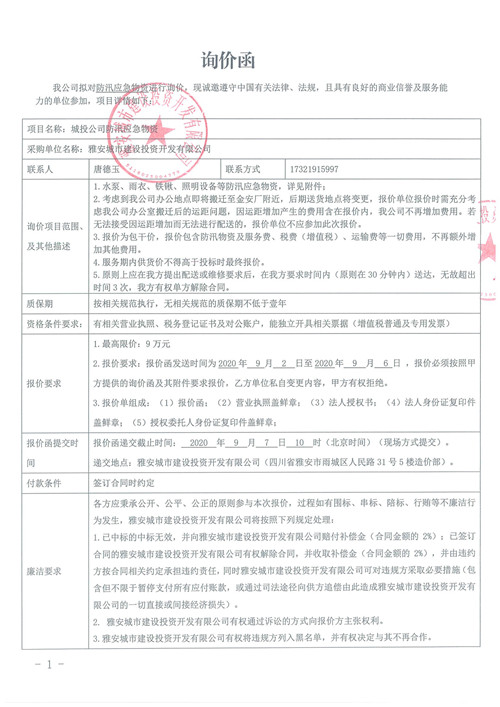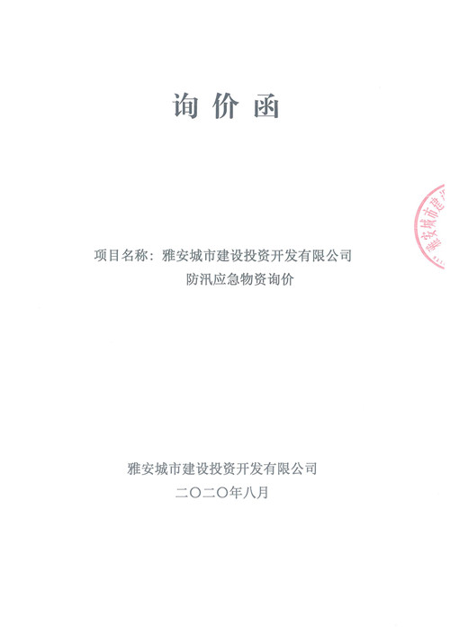 雅安城市建設(shè)投資開發(fā)有限公司防汛應(yīng)急物資詢價(jià)函