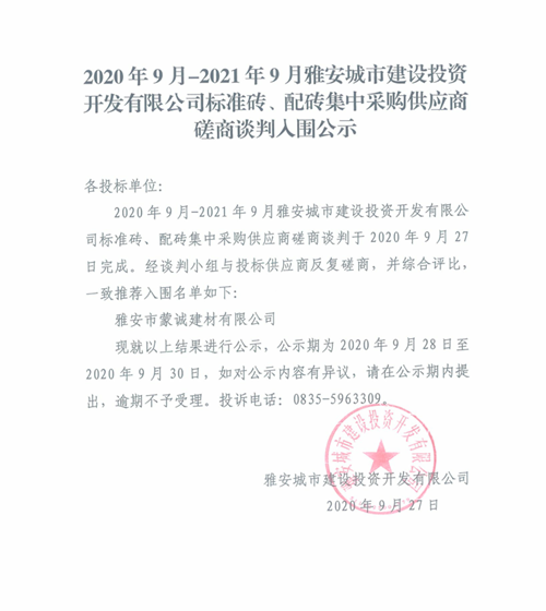 2020年9月-2021年9月雅安城市建設(shè)投資開發(fā)有限公司標(biāo)準(zhǔn)磚、配磚集中采購(gòu)供應(yīng)商磋商談判入圍公示
