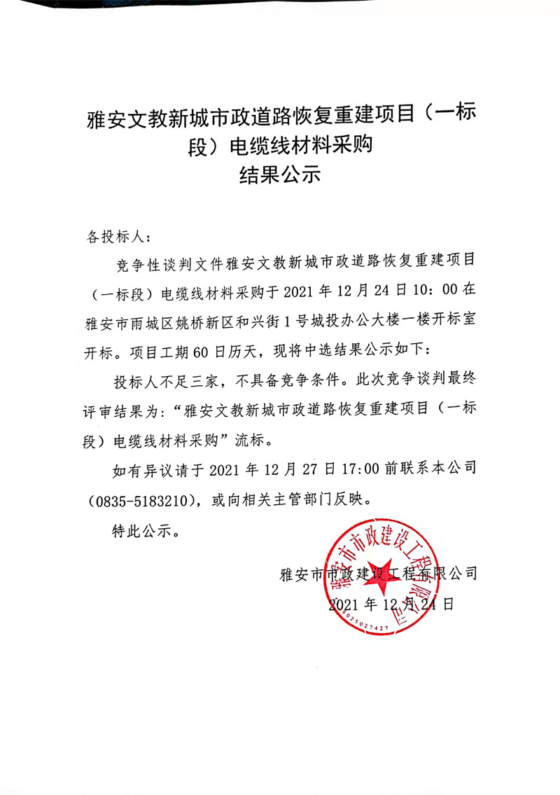 雅安文教新城市政道路恢復(fù)重建項(xiàng)目(一標(biāo)段)電纜線材料采購結(jié)果公示