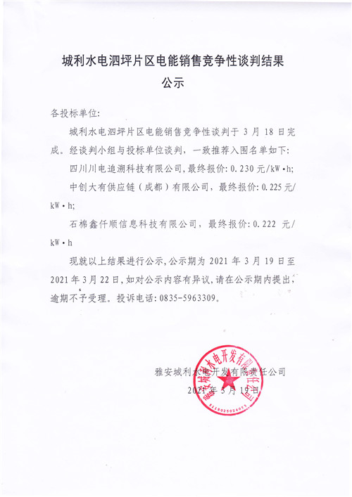 城利水電公司泗坪片區(qū)電站電能銷售競爭性談判結果公示