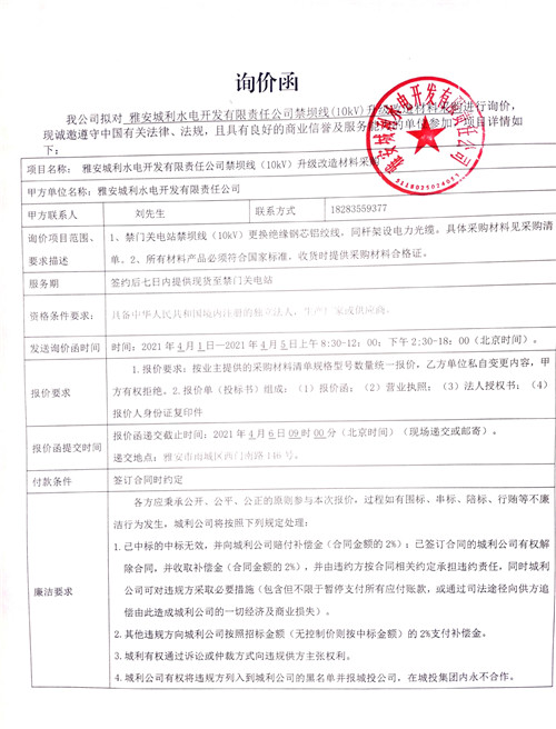 雅安城利水電開發(fā)有限責(zé)任公司禁壩線(10kv)升級改造材料采購詢價(jià)函