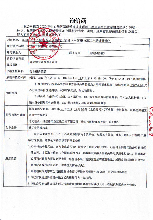 雅安市政公司2020年中心城區(qū)基礎(chǔ)設(shè)施提升項(xiàng)目(興居路與濱江東路連接線)照明、標(biāo)識(shí)、標(biāo)牌詢(xún)價(jià)函