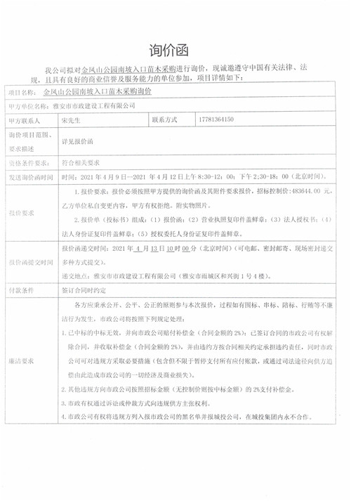 雅安市政公司金鳳山公園南坡入口苗木采購詢價函