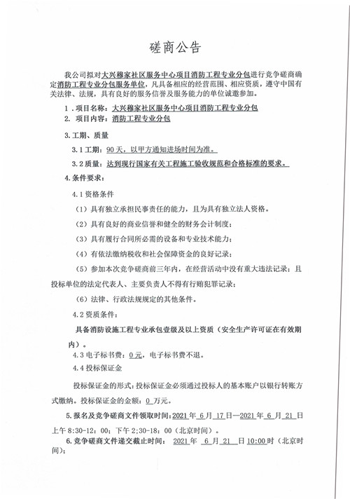 城投建工公司大興穆家社區(qū)服務(wù)中心項(xiàng)目消防工程專(zhuān)業(yè)分包競(jìng)爭(zhēng)性磋商公告