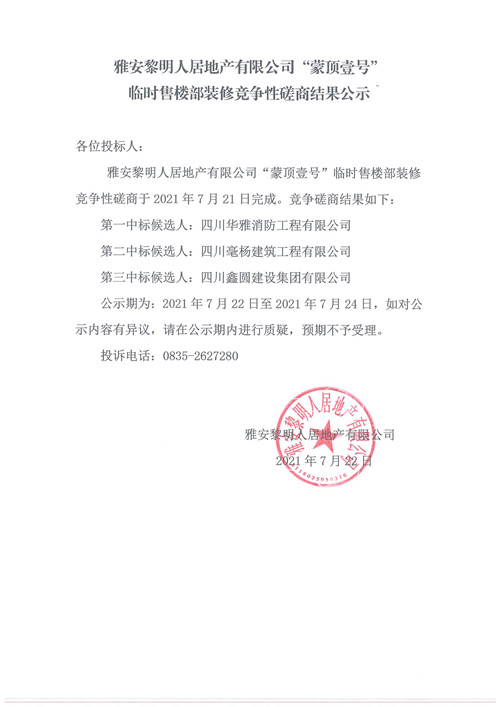 黎明人居公司黎明·蒙頂壹號(hào)臨時(shí)售樓部裝飾裝修競(jìng)爭(zhēng)性磋商結(jié)果公示