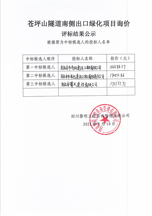 黎明咨詢公司蒼坪山隧道南側(cè)出口綠化項(xiàng)目詢價評標(biāo)結(jié)果公示