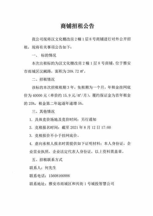 城投智慧公司漢文化棚改房2幢1層8號(hào)商鋪招租公告