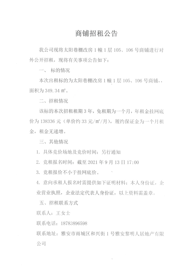 黎明人居公司太陽巷棚改房1幢1層105、106號(hào)商鋪招租公告