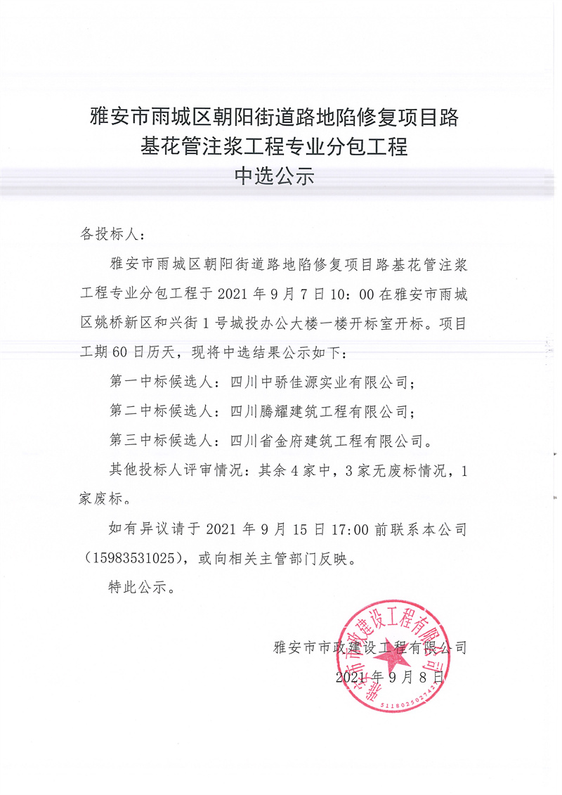 雅安市雨城區(qū)朝陽街道路地陷修復(fù)項目路基花管注漿工程專業(yè)分包工程中選公示