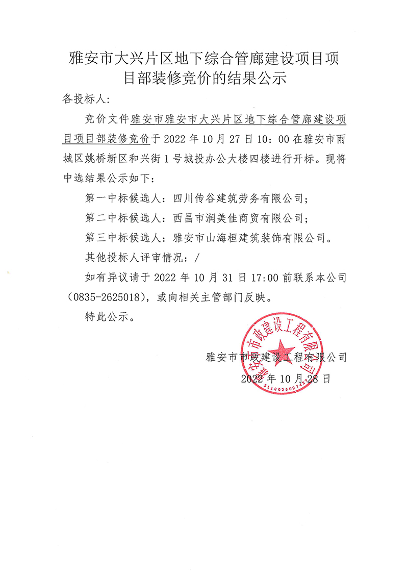 雅安市大興片區(qū)地下綜合管廊建設(shè)項目項目部裝修競價的結(jié)果公示