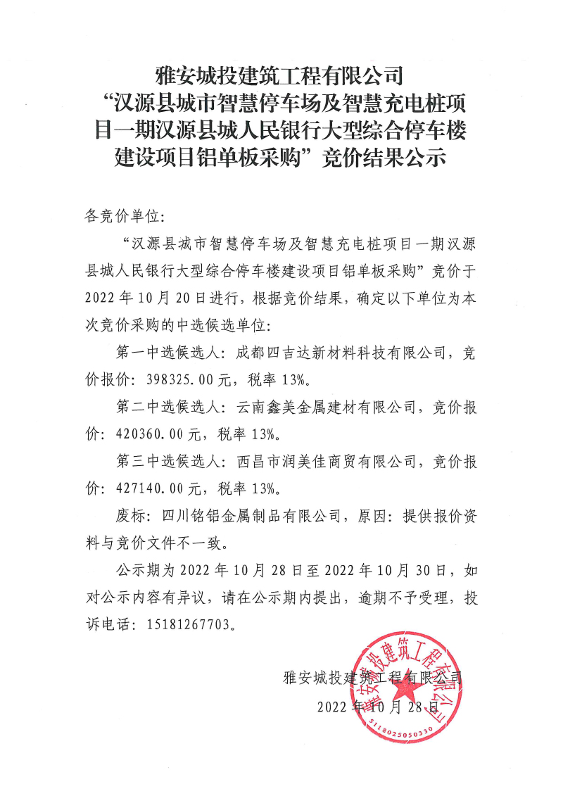 漢源縣城市智慧停車場及智慧充電樁項目一期漢源縣城人民銀行大型綜合樓停車樓建設項目鋁單板材料采購競價結果公示