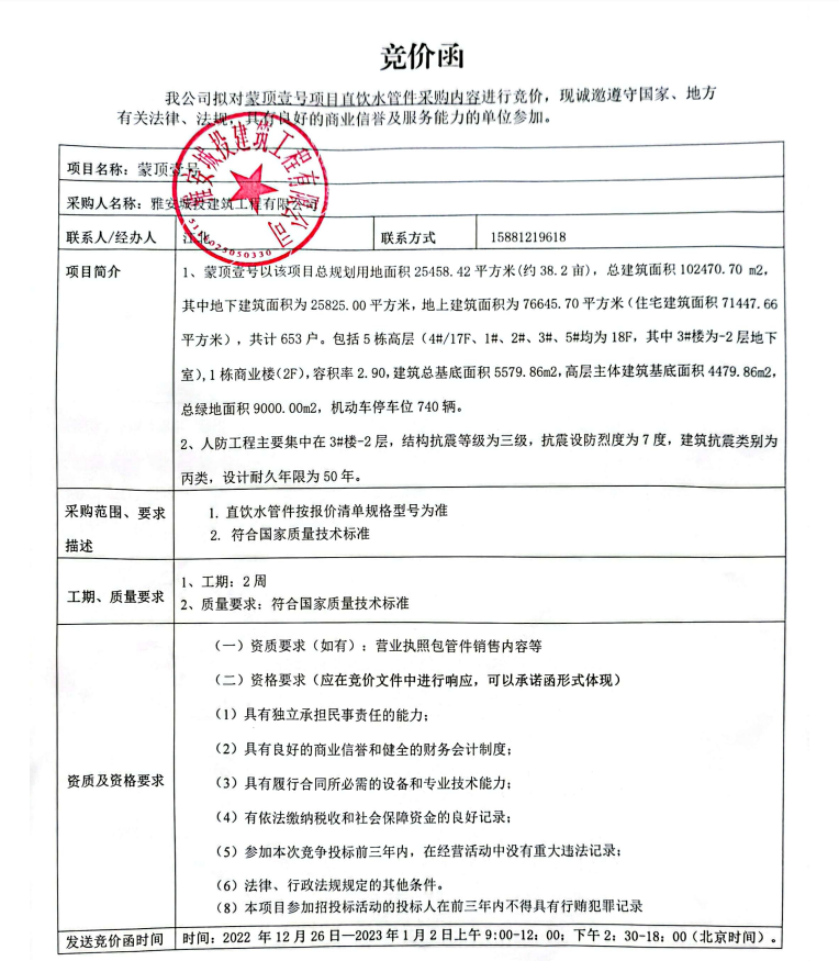蒙頂壹號(hào)項(xiàng)目直飲水管件采購(gòu)競(jìng)價(jià)公告