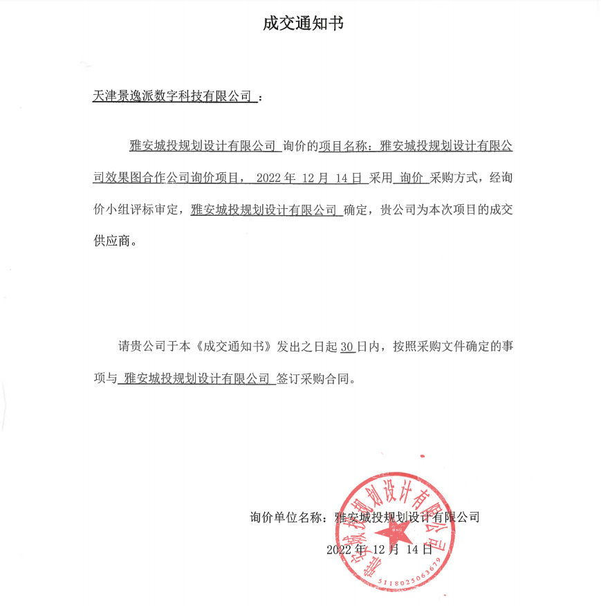雅安城投規(guī)劃設(shè)計有限公司效果圖詢價成交通知書