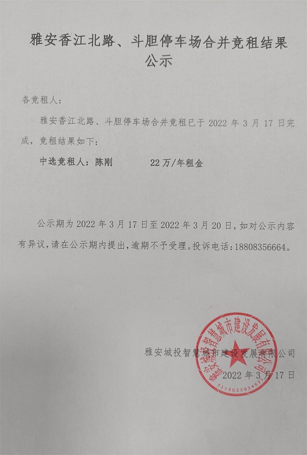 雅安香江北路停車場(chǎng)、斗膽停車場(chǎng)兩處停車場(chǎng)合并競(jìng)租結(jié)果公示