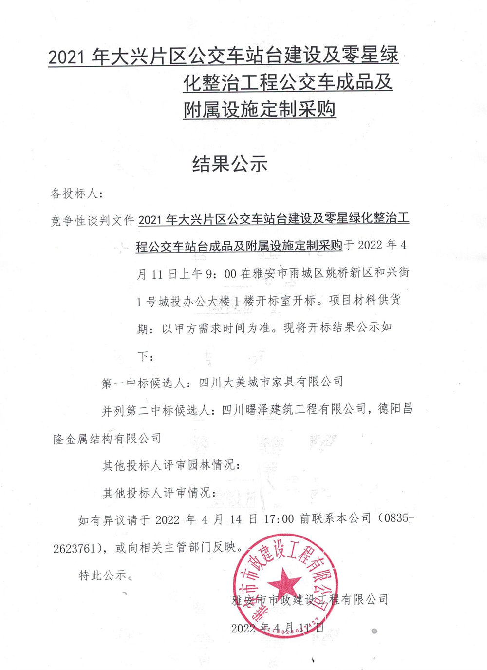 2021年大興片區(qū)公交站臺(tái)建設(shè)及零星綠地整治工程公交站臺(tái)成品及附屬設(shè)施定制采購(gòu)結(jié)果公示
