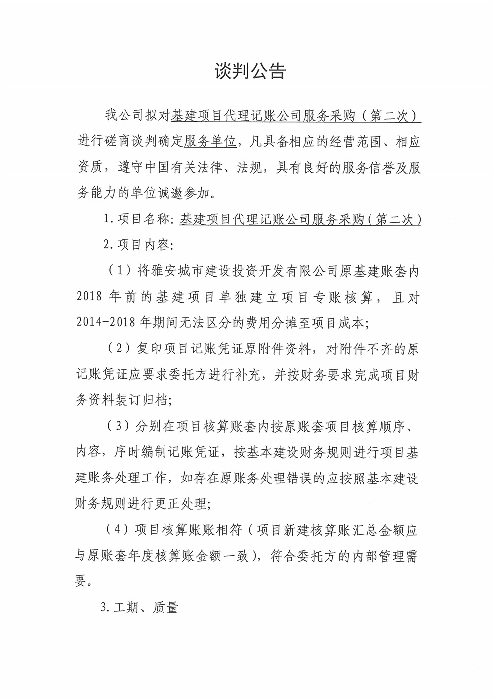 城投公司基建項(xiàng)目代理記賬公司服務(wù)采購磋商談判公告(第二次)