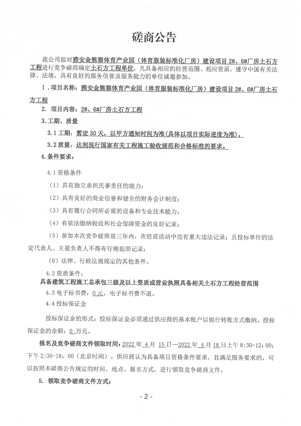 雅安金熊貓體育產(chǎn)業(yè)園(體育服裝標(biāo)準(zhǔn)化廠房)建設(shè)項目2#、6#廠房土石方工程磋商公告