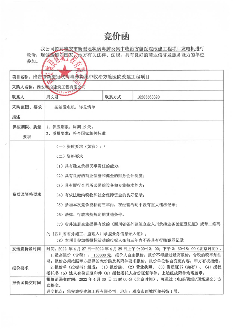 雅安市新型冠狀病毒肺炎集中收治方艙醫(yī)院改建工程項目發(fā)電機(jī)競價函