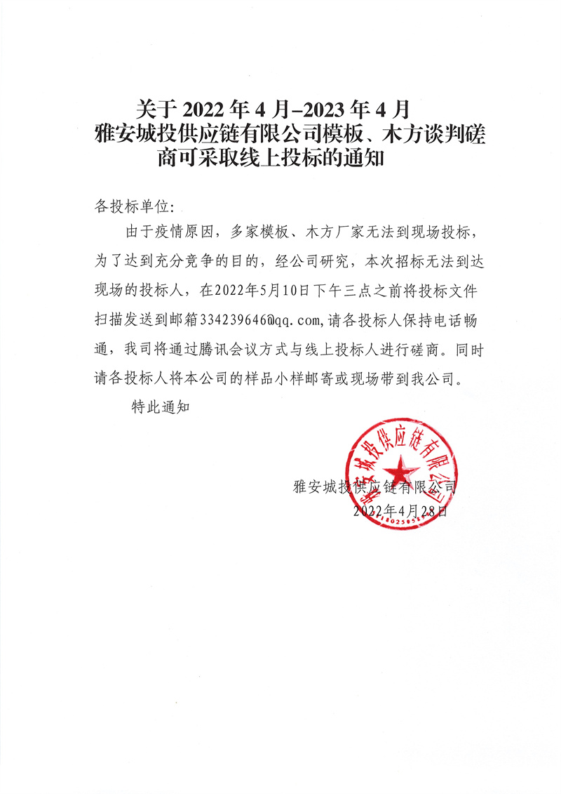 2022年4月-2023年4月雅安城投供應(yīng)鏈有限公司模板、木方談判磋商可采取線上投標(biāo)的通知