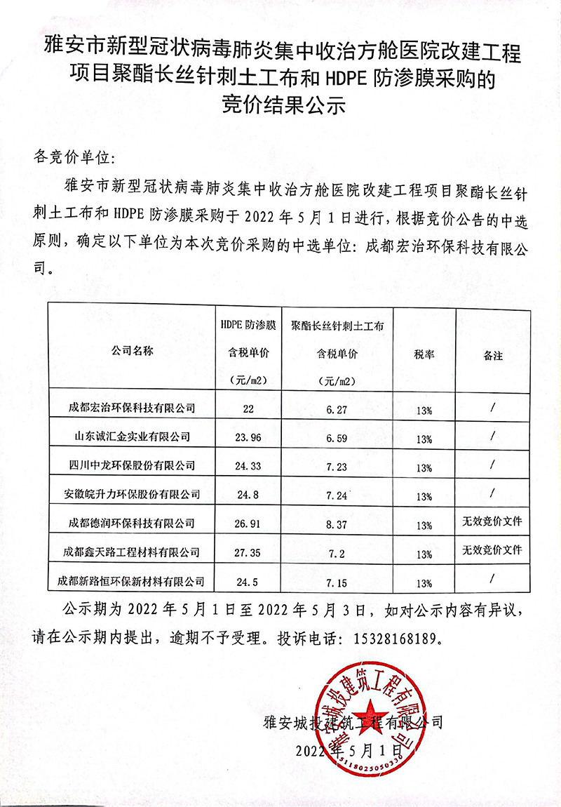 關(guān)于雅安市新型冠狀病毒肺炎集中收治方艙醫(yī)院改建工程項(xiàng)目聚酯長絲針刺土工布和HDPE防滲膜采購的競價(jià)結(jié)果公示
