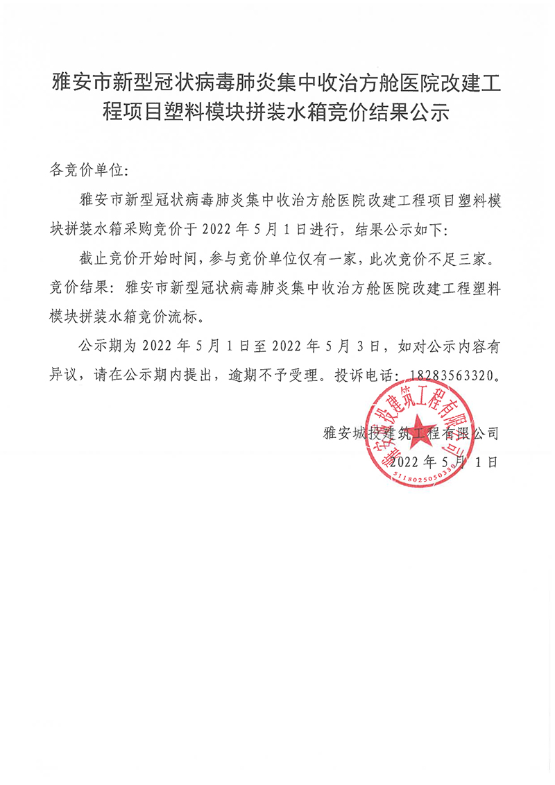 雅安市新型冠狀病毒肺炎集中收治方艙醫(yī)院改建工程項目塑料模塊拼裝水箱競價結(jié)果公示
