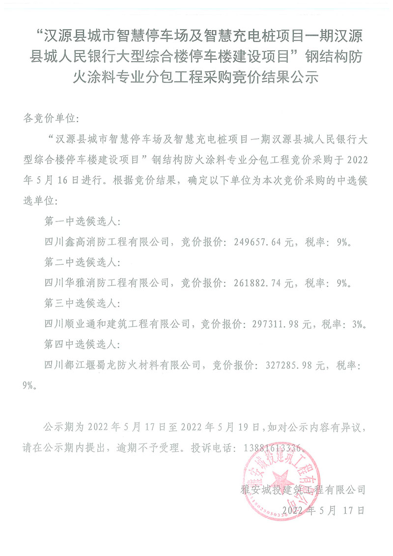 漢源縣城市智慧停車場(chǎng)及智慧充電樁項(xiàng)目一期漢源縣城人民銀行大型綜合樓停車樓建設(shè)項(xiàng)目防火涂料專業(yè)分包工程采購(gòu)競(jìng)價(jià)結(jié)果公示