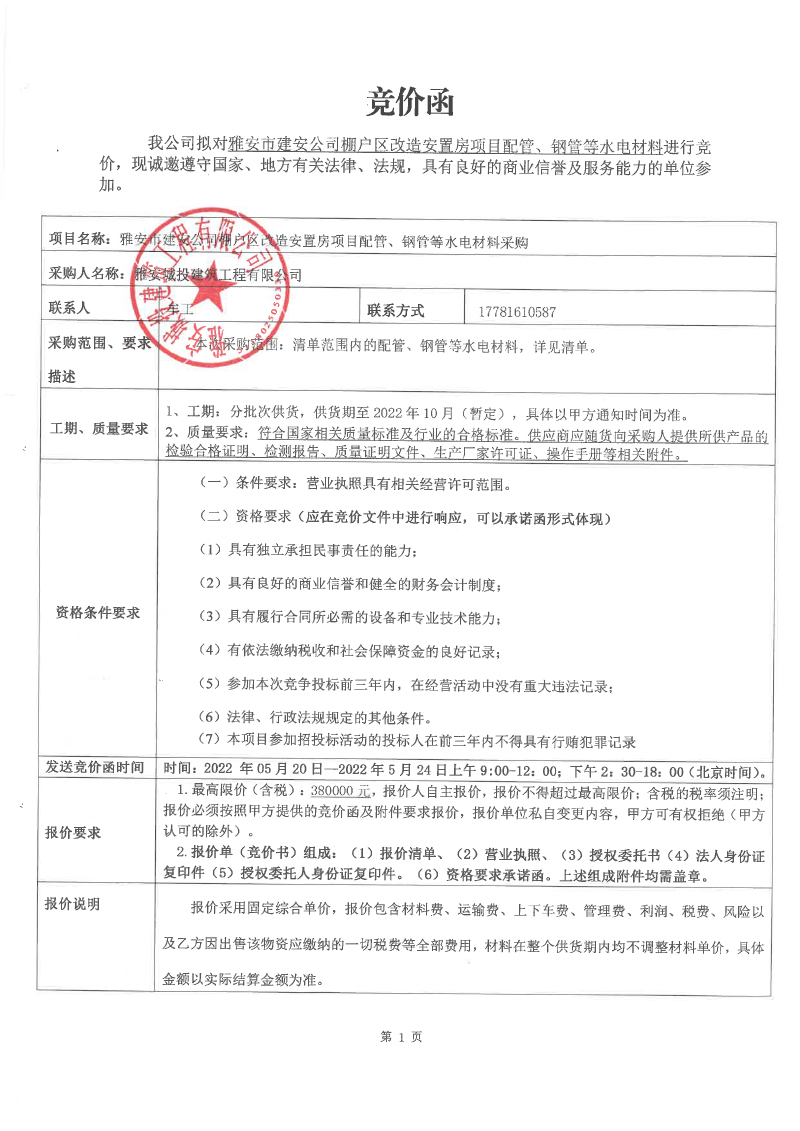 雅安市建安公司棚戶區(qū)改造安置房項目配管、鋼管等水電材料競價函