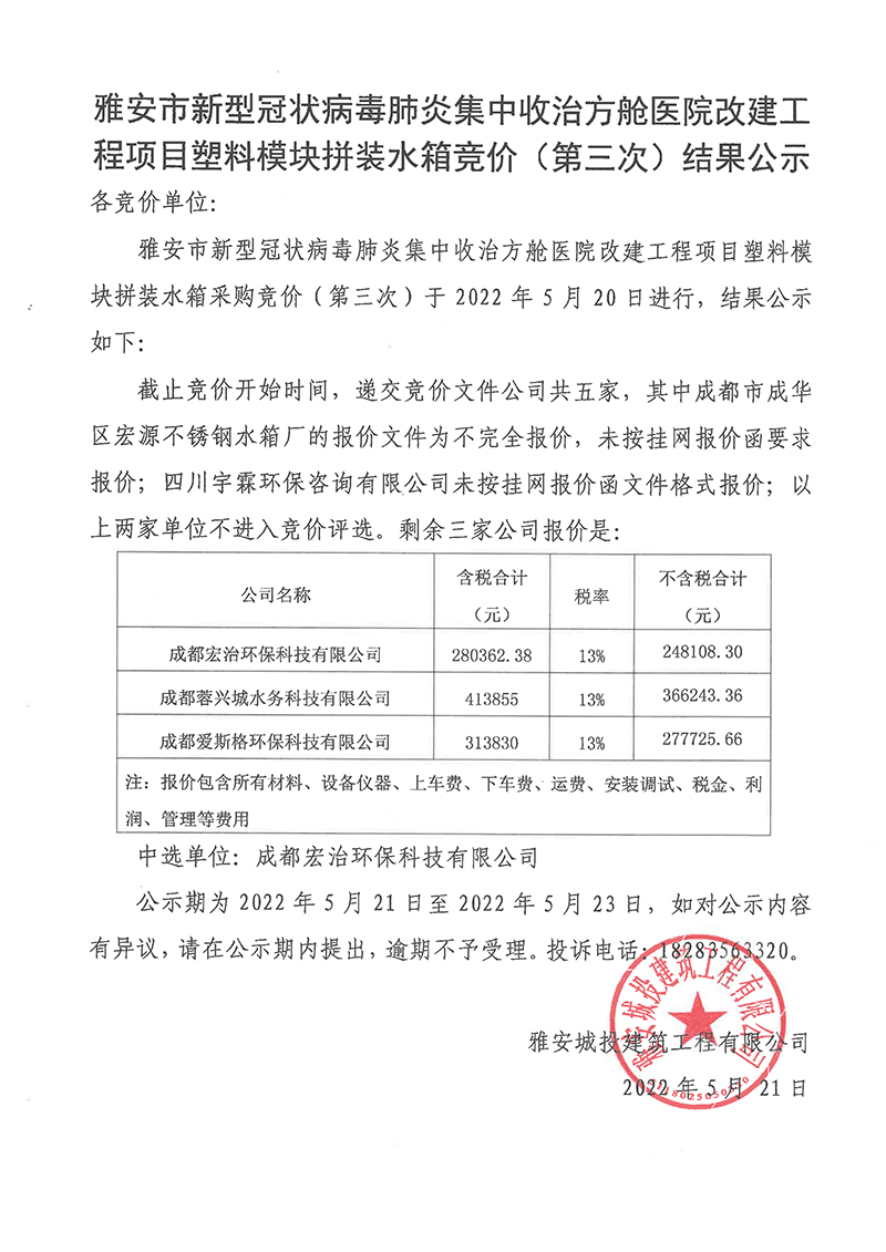 雅安市新型冠狀病毒肺炎集中收治方艙醫(yī)院改建工程項(xiàng)目塑料模塊拼裝水箱競(jìng)價(jià)(第三次)結(jié)果公示