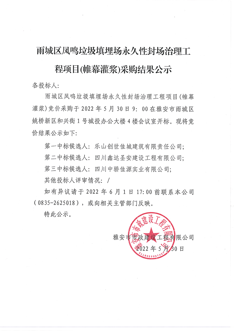 雨城區(qū)鳳鳴垃圾填埋場永久性封場治理工程項(xiàng)目(帷幕灌漿)采購結(jié)果公示