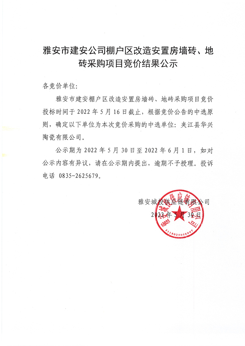 雅安市建安公司棚戶區(qū)改造安置房墻磚、地磚采購競價項(xiàng)目競價結(jié)果公示