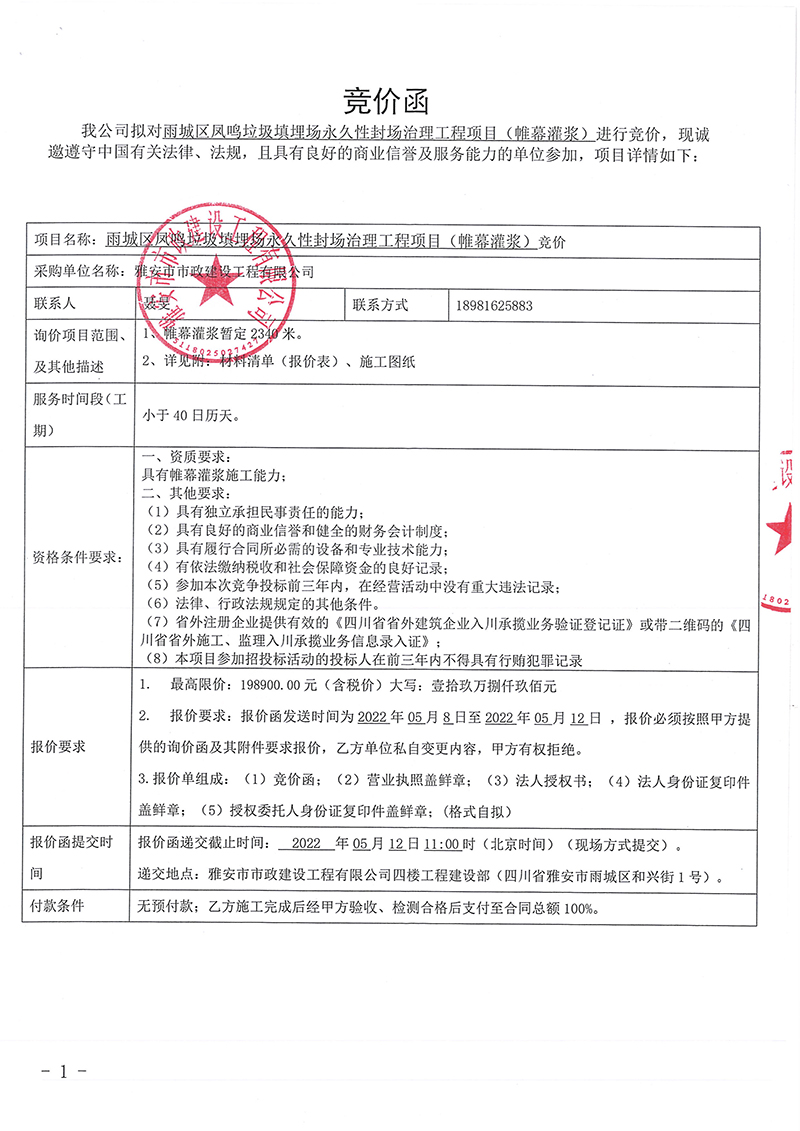 雨城區(qū)鳳鳴垃圾填埋場(chǎng)永久性封場(chǎng)治理工程項(xiàng)目(帷幕灌漿)競(jìng)價(jià)公告