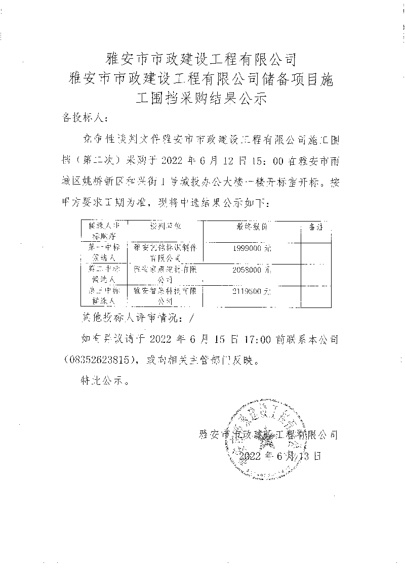 雅安市市政建設工程有限公司儲備項目施工圍擋招采結果公示
